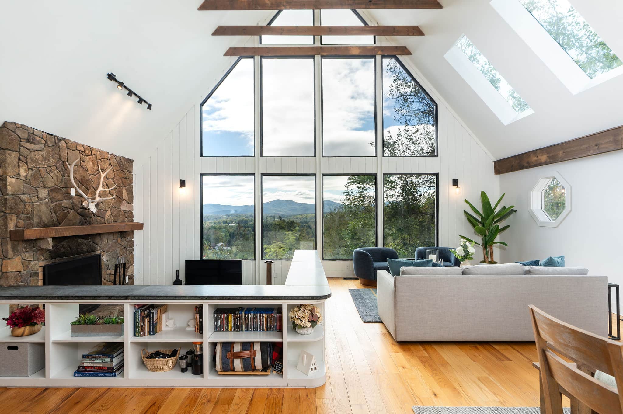 - Bright A-frame great room with floor-to-ceiling windows & panoramic mountain views